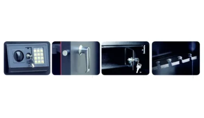 Διαθέτει ξεχωριστό κλειδί για το εσωτερικό ράφι και υπάρχουν έτοιμες τρύπες για το πάτωμα και τον τοίχο.